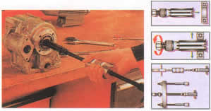 操作說明: 從軸承孔中插進(jìn)拉拔器旋轉(zhuǎn)后部六角螺絲使拉拔器脹大 裝上附件:滑塊沖擊錘 桿式絲桿拉拔器(僅包含在40-2中)